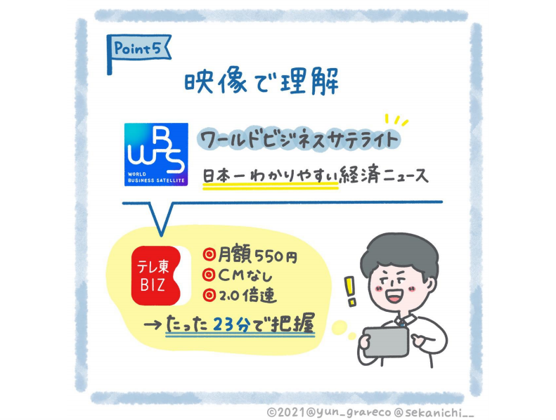 結論から言うと、テレ東BIZというスマートフォンアプリは世界最高なのでいますぐ契約してください。月額550円です。テレビ東京の多くの経済番組が視聴できます。一番のお勧めはWBS(ワールドビジネスサテライト)という1時間の番組でして、CMは全てカットされていますので46分で視聴することができます。また2倍速機能もありますので、たった23分で終わります。