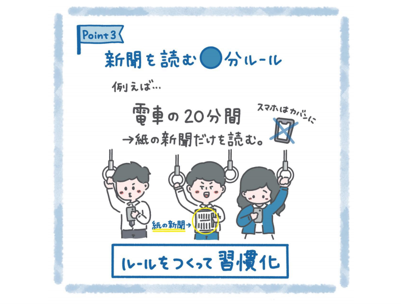 例えば電車に乗る20分間はスマホを鞄に入れて紙の新聞だけを読むというルールを自分で作ります。20分間で読みきれなくても駅に着いたら必ず捨てるといったルールも加えれば継続しやすくなると思います。自分なりのルールを作って習慣化しましょう。