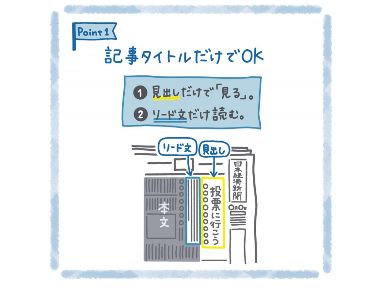 まずは読む「心のハードル」を下げましょう。大事なことは「見る」です。まずは見出しだけ見ましょう。例えば「投票に行こう」などの見出しに注目したら、次はリード文だけ読みましょう。リード文とは本文の前の要約です。