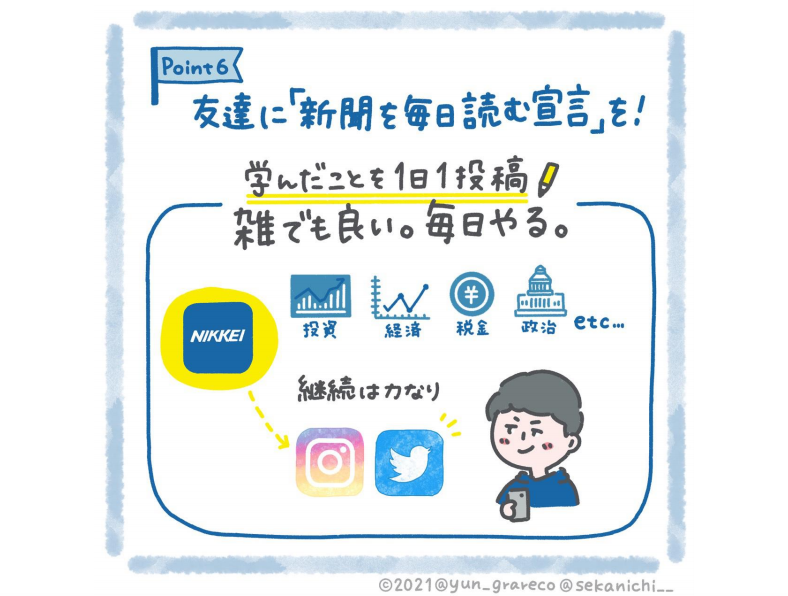 筋トレと同じで、一人だとどうしてもサボってしまいます。大事なことは友達に「毎日新聞を読む」と宣言をすることです。そして一日一投稿でいいので学んだことをSNSで発信してみてください。