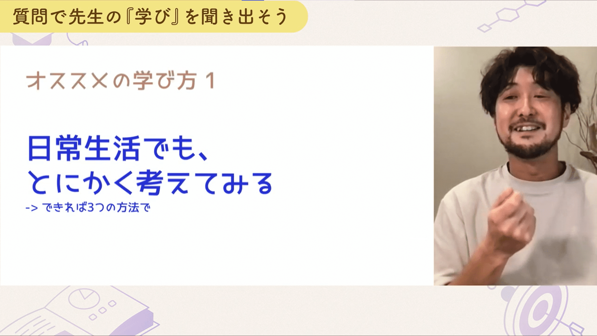 3320経験的アプローチの場合は詳しい人やに聞いたり、色んな人に幅広く聞いたりすることが大切です。自分の経験だけでは足りないことが多いので、いろんな視点から仮説を出してもらいましょう。