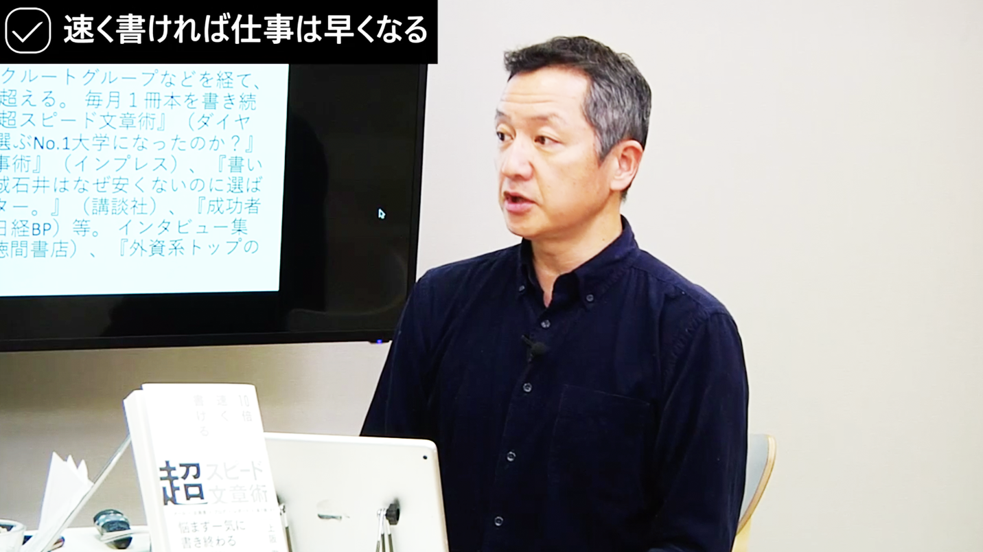 13実は先生はむかし1日300字しか書けなかったそうです。それが今では1時間で3,000字、さらに5日間で本を1冊というペースで文章を書ける爆速ライターへと変貌を遂げられた上阪先生に、超スピード文章術について学んでいきます。
