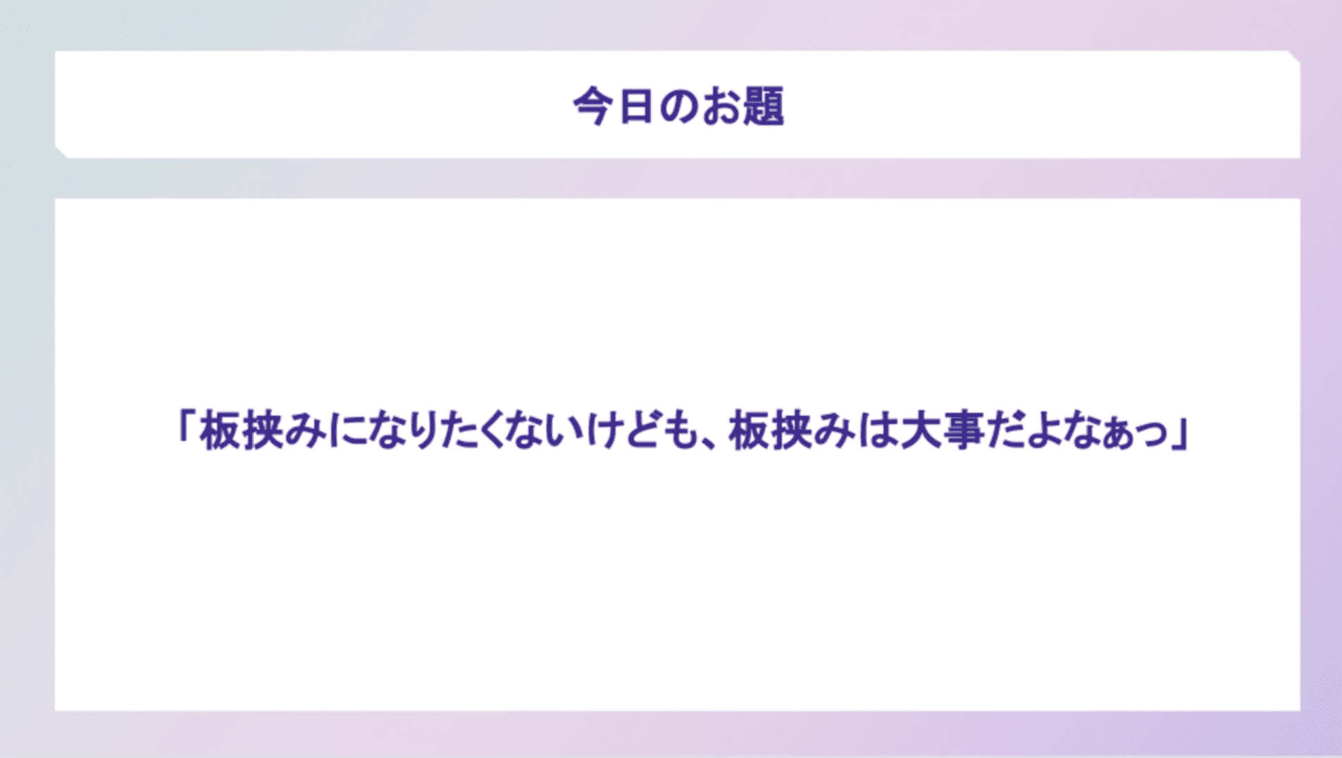本日のテーマは、題して「板挟みになりたくないけども、板挟みは大事だよなぁっ」です。みなさんも板挟みになることはあると思いますが、日常の中でどんな板挟みになっていますか?